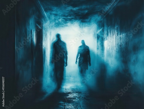 Haunted Halloween night ghastly figures floating through a dark, haunted house, captured in eerie lighting, Creepy, Cool Tones, Atmospheric