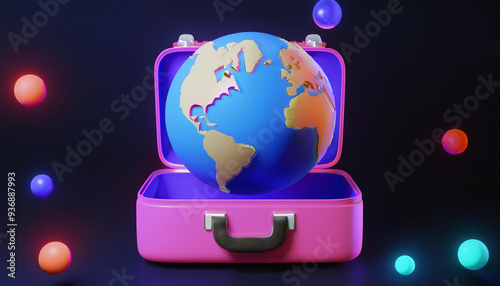 ピンク色のスーツケースの中に地球儀が収められているデザインです。スーツケースは開いた状態で、背景は暗めの色調で、カラフルな球体が浮かんでいます。全体的にポップで明るい雰囲気を持ち、旅行や地球規模のテーマを連想させるイメージです。generative AI