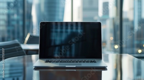 In a contemporary office space, a sleek laptop rests on a polished table, with a stunning city skyline visible through expansive glass windows, ideal for a productive day