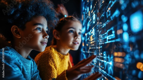 A group of children using AI-powered educational tools and digital technology, embodying the future of education and the enhancement of learning experiences.