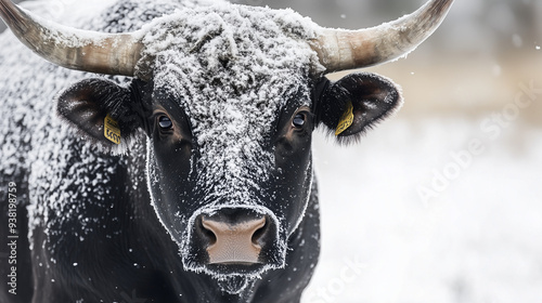 Czarny byk z dużymi rogami, którego sierść jest pokryta warstwą śniegu. Byk spogląda intensywnie w stronę kamery na tle zimowego krajobrazu.