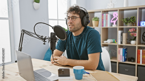 A young hispanic man with a beard hosts a podcast in a well-lit radio studio, equipped with a laptop and microphone.