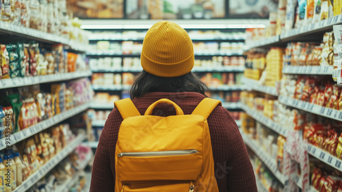Klient w musztardowej czapce i plecaku w tym samym kolorze przemieszcza się między półkami dobrze zaopatrzonego sklepu spożywczego