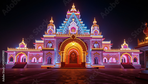 The stunning exterior of a Durga Puja pandal artistically adorned with elaborate lighting traditional motifs and grand decorations