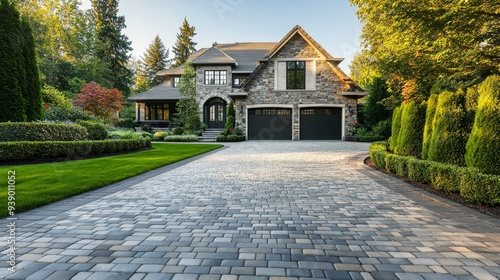 A beautifully maintained driveway leads up to a luxury house surrounded by lush greenery, showcasing meticulously laid pavers and vibrant landscaping