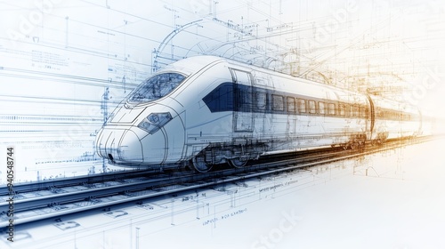 A futuristic train design set in a dynamic architectural blueprint, showcasing modern transportation innovation and engineering excellence.