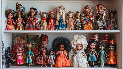 A collection of various dolls from different cultures displayed on a light solid color shelf, emphasizing diversity in doll collecting
