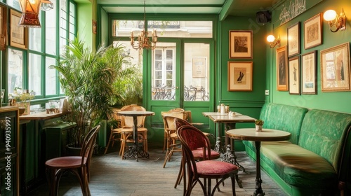 A stylish Paris cafe featuring vintage furniture and green tones, offering a relaxing and timeless setting.