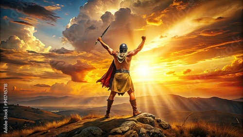 Glory and Defiance - Triumphant, heroic, golden hour, warm hues, celebratory pose