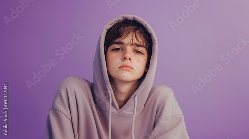 A teenage boy with a hoodie pulled over his head, sitting alone with a sad look on a lavender background.