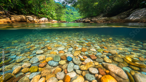 Przejrzysta woda spokojnej rzeki odsłania kolorowe, gładkie kamienie, które leżą na dnie.