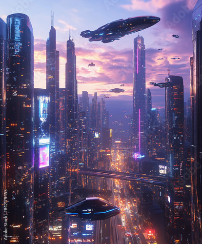 futuristic city skyline at dusk with towering skyscrapers made of glass and metal, neon lights reflecting off the buildings