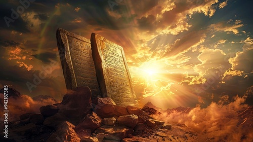 Divine commandments on stone tablets on sunlit mountain, realistic image with religious significance