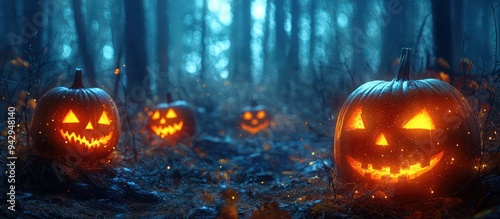 Halloween night scene with spooky glowing pumpkins in a dark forest.