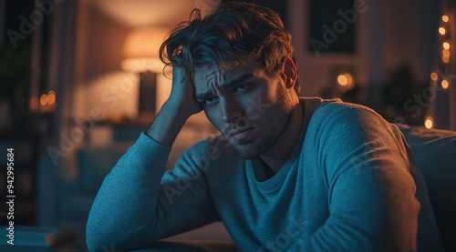 A man sitting on the couch with his head in hands, looking distressed and emotional, showing signs of anxiety or depression. The concept of emotional pain and suffering due to life events.