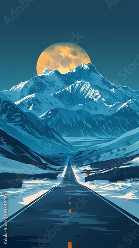 Digital technology road ahead and snow mountains scene poster background