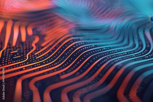 Nanoscale view of the e-skin fabrication process, intricate formation of circuitry with vibrant colors and abstract tech patterns in a 3D visualization, highlighting forefront of wearable technology.