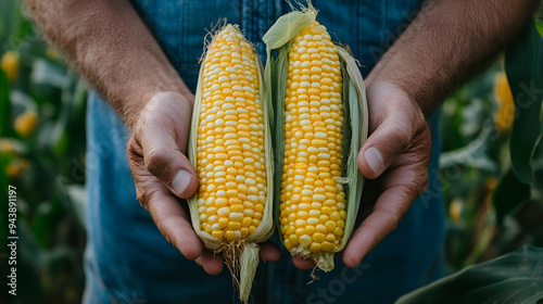 dos elotes recien cortados por el agricultor cosecha de alimentos del campo saludables en la naturaleza agricultura