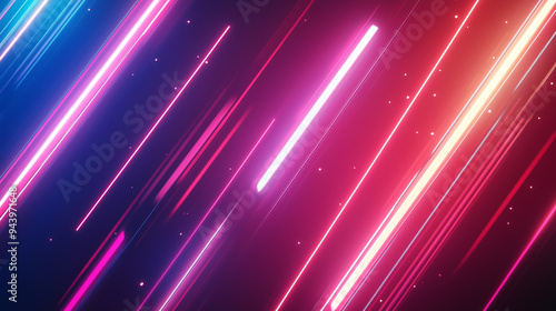 Ciemne tło jest ożywione przez neonowe, futurystyczne błyski i świetlne linie, które tworzą efekt ruchu i pulsacji.