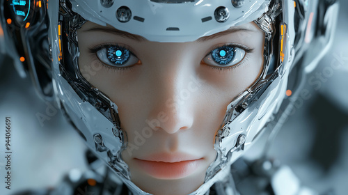 Twarz kobiecego robota w koncepcji sztucznej inteligencji, z nowoczesnym, futurystycznym wyglądem. Oczy robota są zintegrowane z jego strukturą, świecąc delikatnym blaskiem.