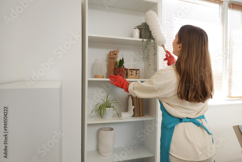 Female janitor with pp-duster cleaning plant on shelf in room, back view