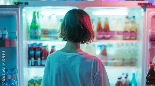 young woman with short hair wearing a white t-shirt standing in front of an open refrigerator, filled with food and drinks, cinematic style with teal and pink lighting, hyper-realistic detail