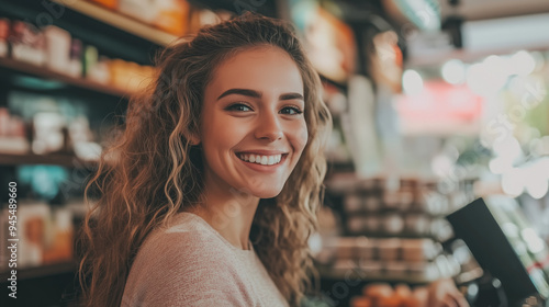 Atrakcyjna, młoda sprzedawczyni przy kasie, serdecznie uśmiechająca się do klientów.