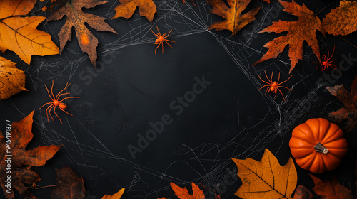 Widok z góry na mroczną kompozycję z okazji Halloween. Pająki, ozdoby i pajęczyny są rozmieszczone na czarnym tle, tworząc straszną i intrygującą scenerię.