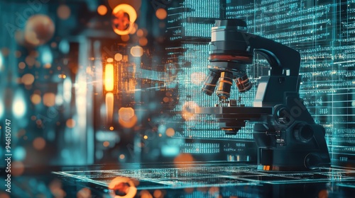Microscope viewed through a digital grid, combining scientific exploration with technological elements in a futuristic background.