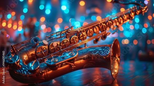 A polished saxophone resting on a bar top, illuminated by colorful lights during a lively evening jazz event