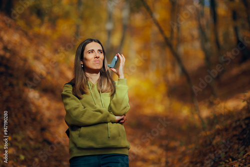 Woman Suffering from Autumn Allergies Holding Inhaler. Unwell asthmatic person feeling sicker during fall season