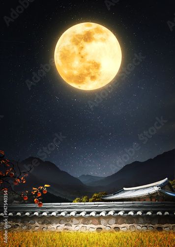 Korean traditional holiday Chuseok thank you banner and Chuseok greeting card background with abundant autumn full moon, tiled house and rice ears