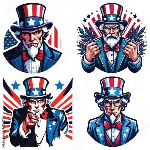 Patriotic Uncle Sam illustrations with various expressions, colorful background, American pride
