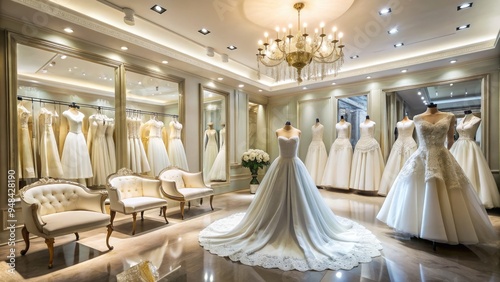 Elegant bridal gowns adorn racks and mannequins in a luxurious, upscale wedding dress store with soft lighting, mirrors, and ornate furnishings.
