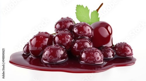 Close-up of fresh cherries in glossy syrup with a green leaf. Perfect for culinary, food, and dessert-related concepts.