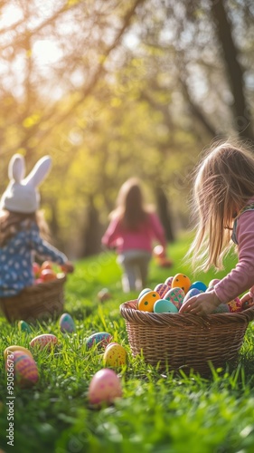 Children dressed in Easter bunny costumes collecting colorful painted eggs in the grass, holding baskets full of colorful Easter eggs. The scene captures the joy and excitement of an Easter egg hunt.