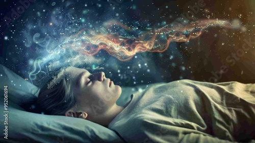 A sleeping person experiences dream analysis as neural networks visualize subconscious thoughts in a serene bedroom setting