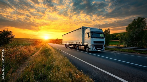 White truck driving on the asphalt road in rural landscape at sunset : Generative AI