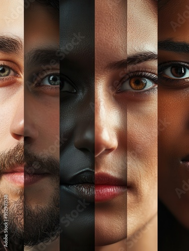 Faces of diverse individuals separated by a stark line, representing societal divisions and emphasizing unique cultural identities. Generative AI