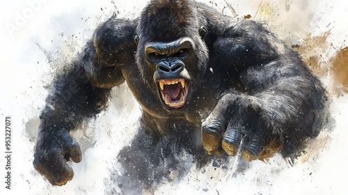 Gorilla Fury: A fierce and powerful gorilla charges forward, teeth bared and muscles tensed, in a dramatic digital art illustration that captures the primal energy of nature's apex predator.