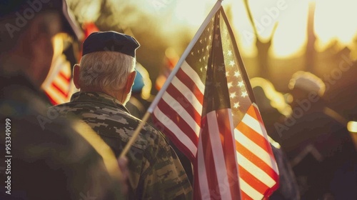 Veterans with flags standing in remembrance, medium shot capturing the solemnity and respect, natural sunlight,