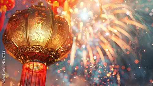 A gleaming golden lantern, adorned with traditional Chinese calligraphy, amidst a symphony of colorful fireworks,