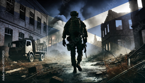 A lone soldier walking through a war-torn urban landscape with the Scotland flag overlay, symbolizing the bravery and resilience of military forces in conflict zones.