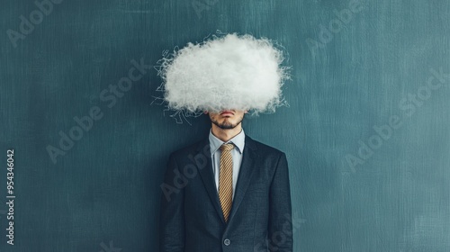 A man in a suit stands against a blue wall, his head replaced by a fluffy cloud, creating a surreal and whimsical image.