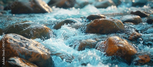 Close up of large boulders in a mountain creek Rapids of a swift river with copy space Foamy water current Quick flow near damp stones Background of clear water waves Natural texture of the shiny stre