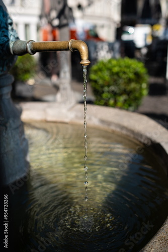 Old vintage public drinking water fountain in European city. Close up shot, shallow depth of field, no people
