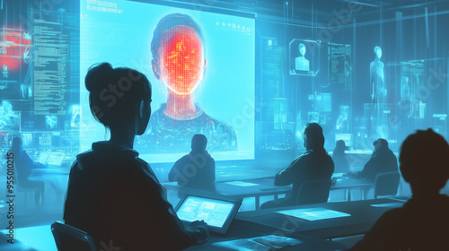 Futuristic AI-Powered Classroom with Students Interacting with Holographic Teachers in an Immersive Learning Environment