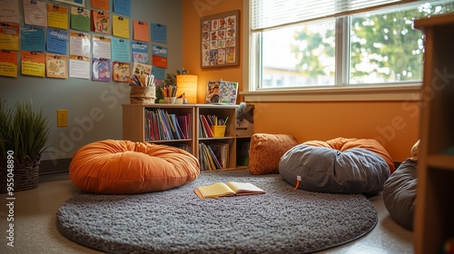 A cozy and inviting reading nook in a colorful classroom, with bean bags, bookshelves, and educational materials on display.