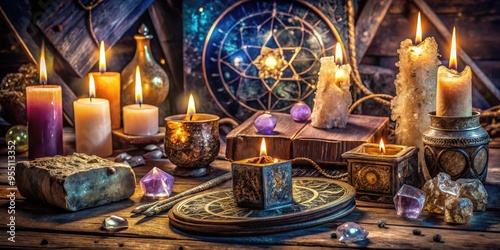 Mystical crystals, candles, and ancient tomes surrounded by intricate spellbinding symbols, arcane runes, and celestial circles, evoking an atmosphere of mysticism and magical exploration.