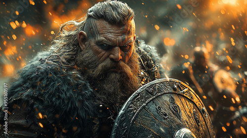 battle-scarred dwarf warrior with a fierce expression, holding his shield amidst flying embers, preparing for the final stand